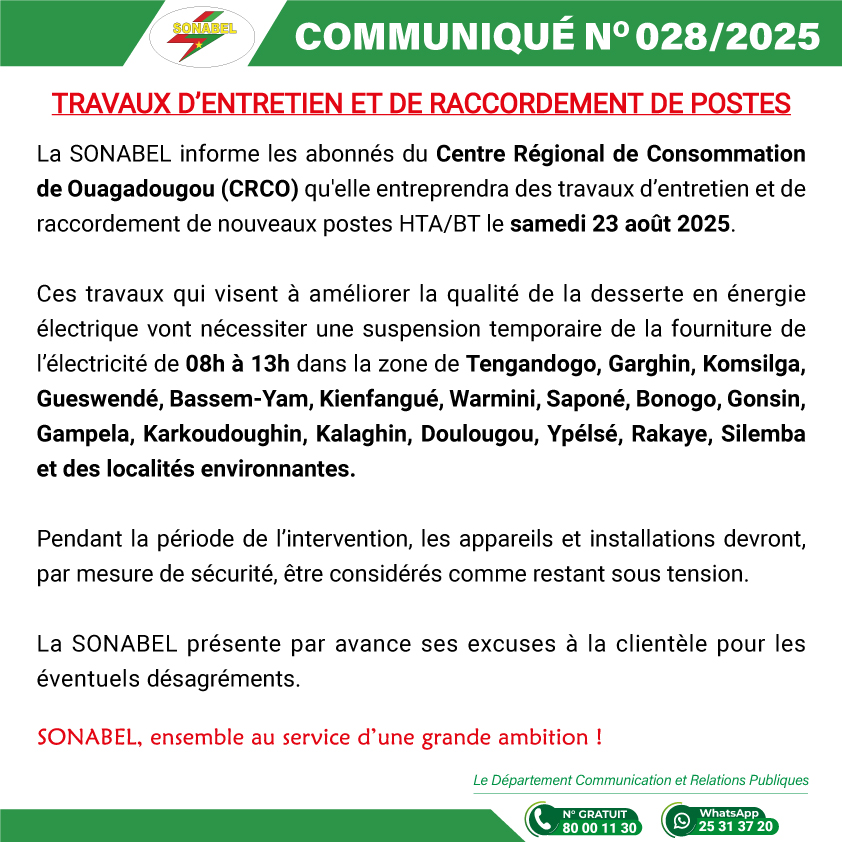 Par conséquent, la SONABEL procédera à l’ouverture des vannes de l’évacuateur de crue du barrage le mercredi 27 août 2025 à partir de 08 heures.
